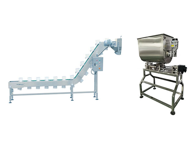 這套設(shè)備是人工稱重+碗式提升機+給袋式包裝機+灌裝機組合而成。